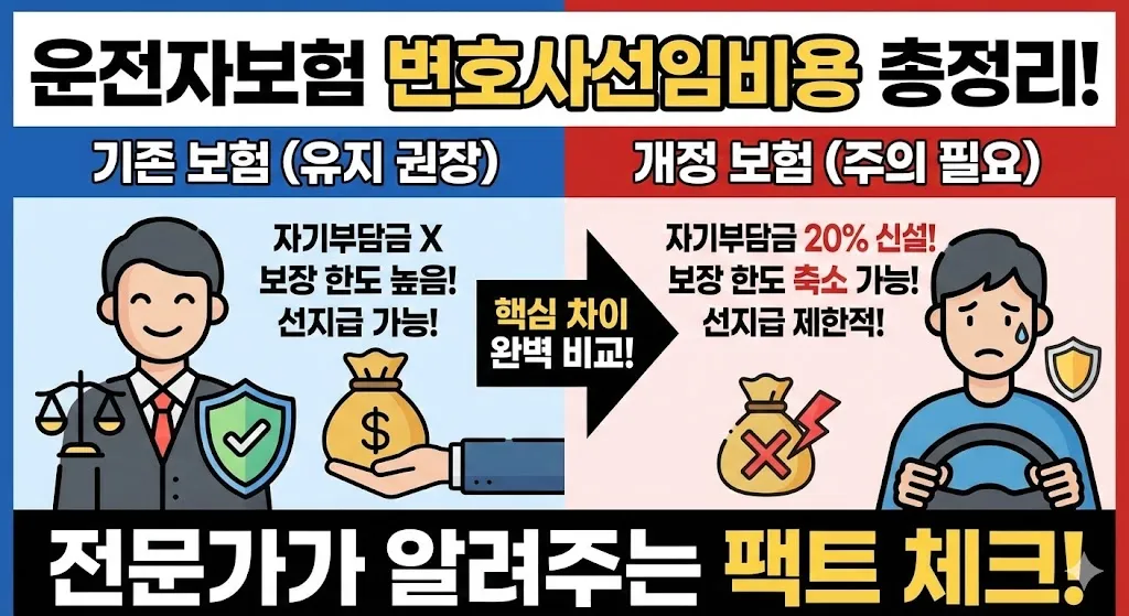운전자보험 변호사선임비용 기존보험과 개정보험 차이 총정리에 대해 알아보겠습니다. 5천만원 보장에서 500만원 수준으로 축소되는 개정안 이후, 기존보험과 신규 개정보험 간의 차이가 극명하게 벌어졌습니다. 이 글에서는 보장 한도·자부담·지급 조건·보험료 차이를 한눈에 비교해드립니다.